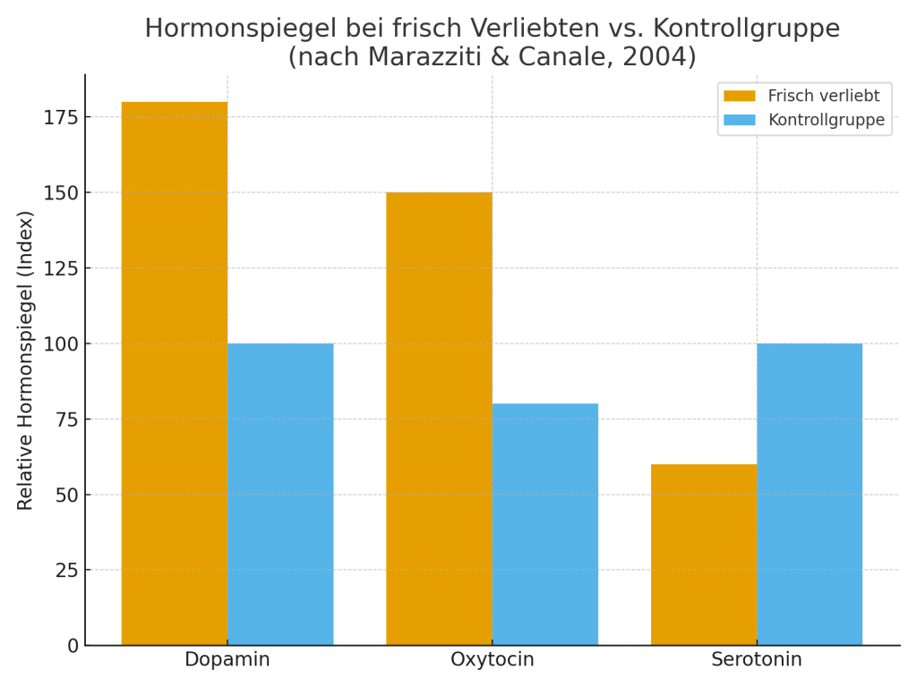 Hormonspiegel bei frisch Verliebten im Vergleich zu einer Kontrollgruppe. Quelle: Marazziti & Canale (2004), Psychological Medicine.